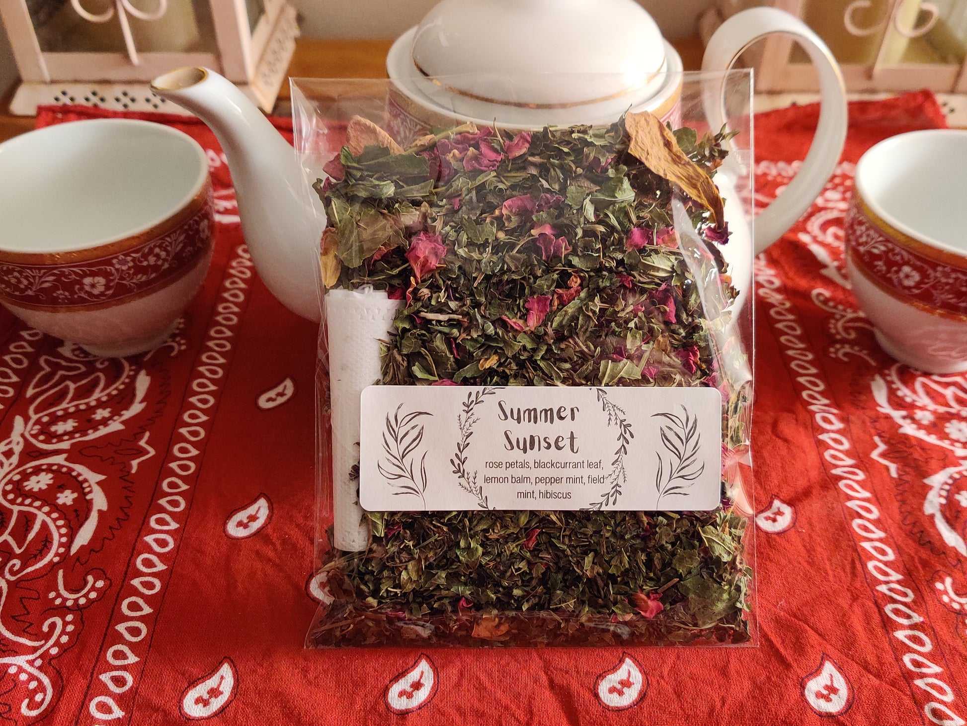 Sweet smell of summer evening, filled with fragrance of roses, citrussy notes of lemon balm, cooling freshness of mint, balsamic fruitiness of black currant rounded by reddish tartness of hibiscus. Perfect after dinner blend, which aids digestion and helps to relax after a hard day.